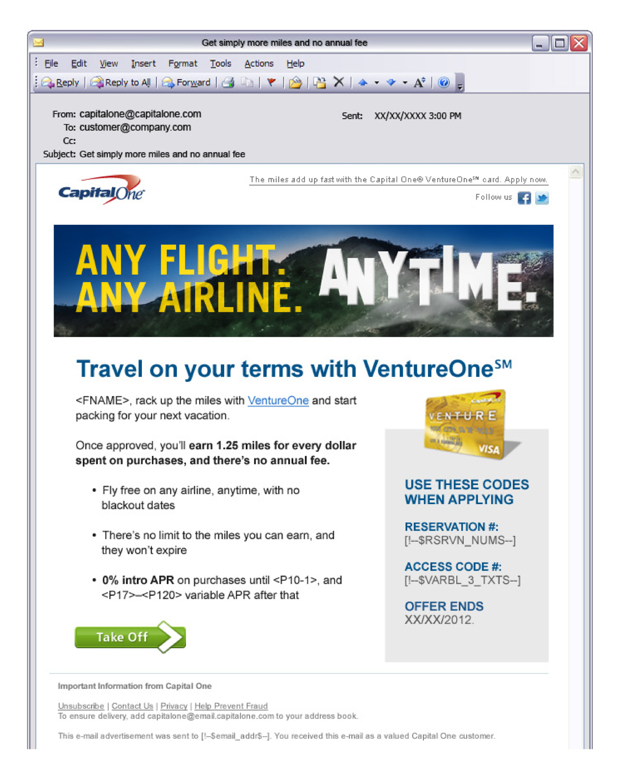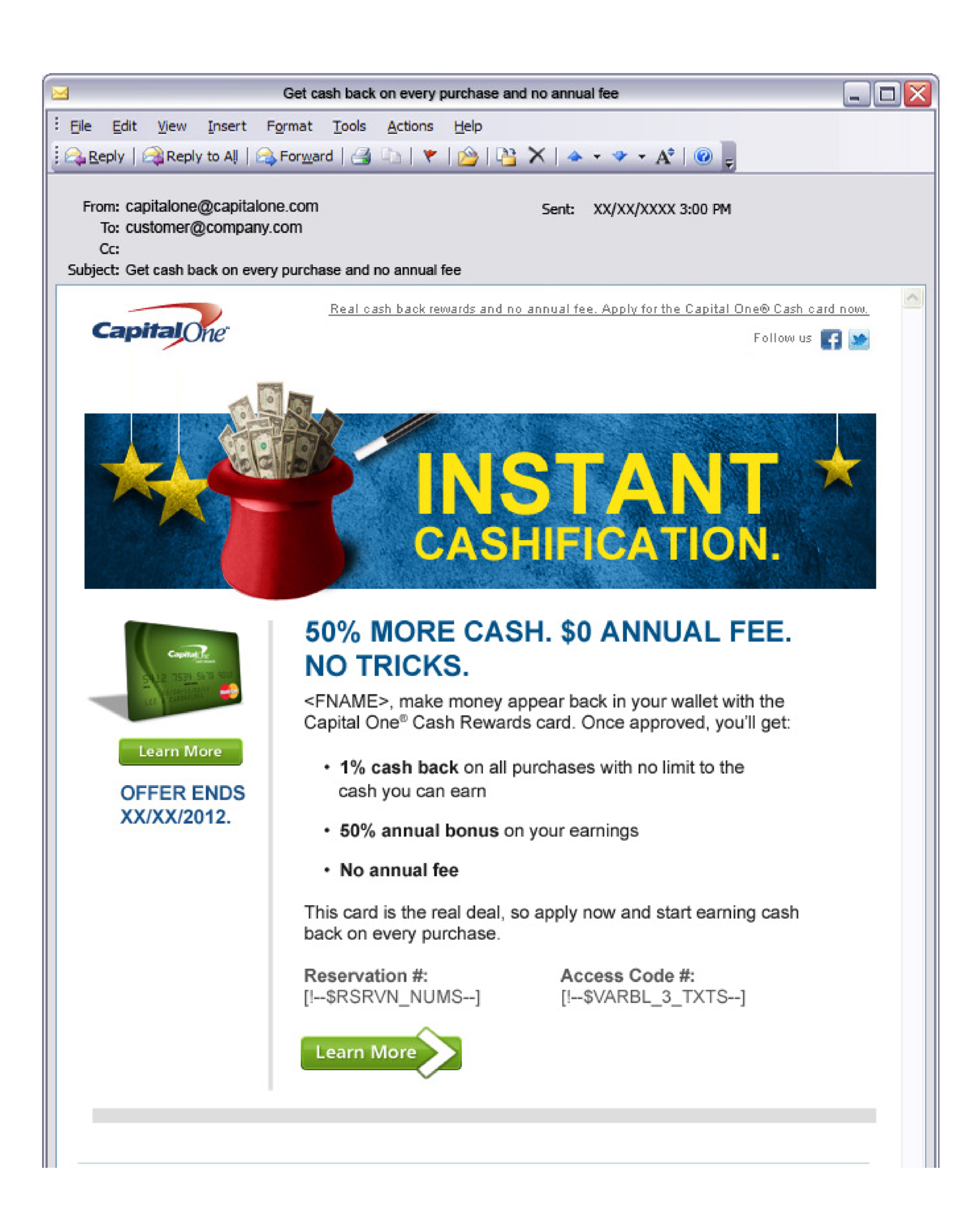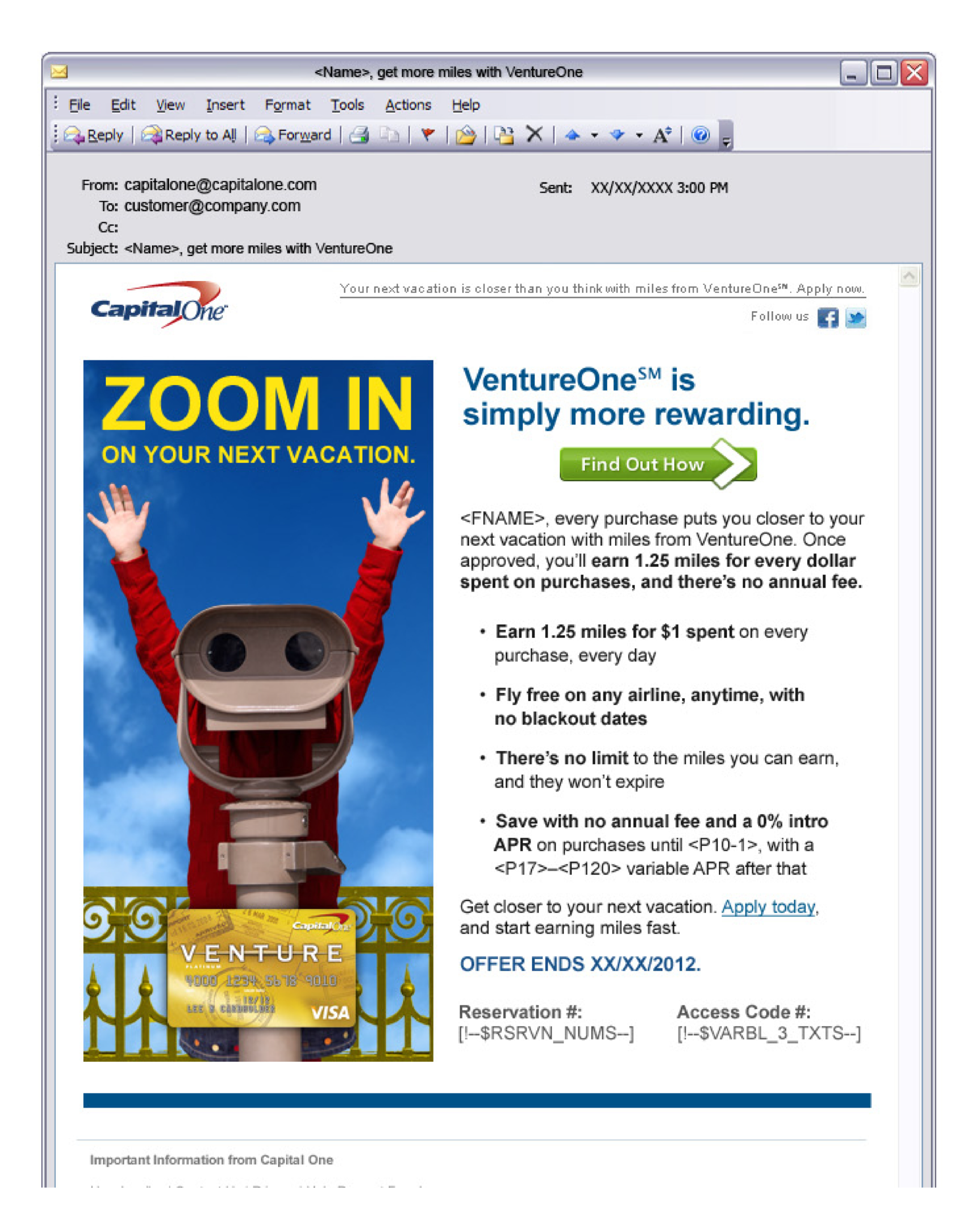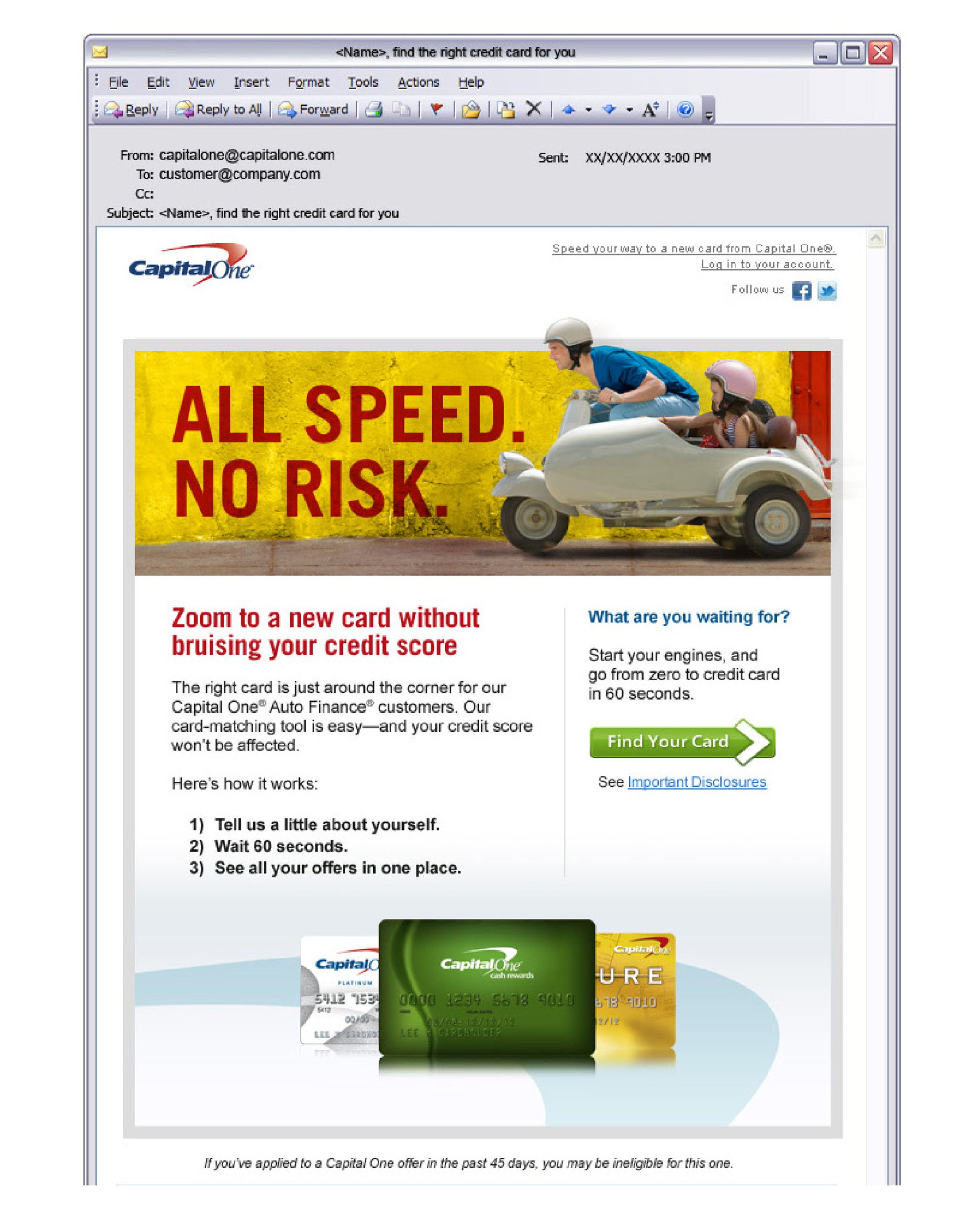 I developed concept and copy for Capital One email campaigns across several product lines, including VentureOne, Cash Rewards, and Auto Finance. Each product had its own audience and brand, so the job was making that ask feel distinct every time – all while working within Capital One's regulatory and compliance framework.
