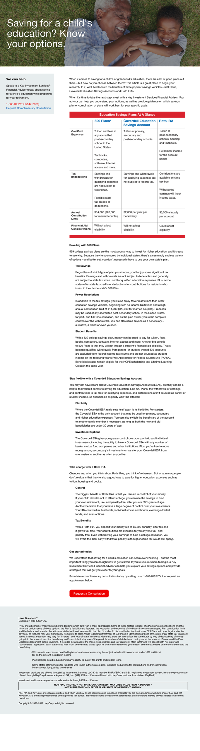 This is an educational article for KeyBank's investment services arm, targeting their "preserving wealth" segment (primarily retirees looking to invest in a grandchild's education). The job was walking that audience through the differences between 529 Plans, Coverdell ESAs, and Roth IRAs in a way that felt approachable without oversimplifying it or running afoul of compliance, then guiding them toward a consultation CTA without the hard sell.